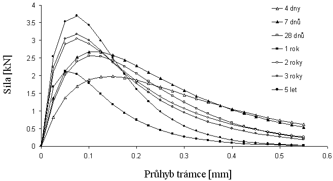 Pro účely předkládaného příspěvku se využilo sady l-d diagramů získaných z experimentů na betonových vzorcích různého stáří. Série zkoušek byla prováděna Ing. Vlastimilem Bílkem, Ph.D. ve zkušebnách firmy ŽPSV Uherský Ostroh, a. s. a Ing. Pavlem Schmidem, Ph.D. ve zkušebně Ústavu stavebního zkušebnictví FAST VUT v Brně. Konkrétně byly postupně zkoušeny vzorky staré 4 dny (2 vzorky), 7 dní (2×), 28 dní (3×), 1 rok (3×), 2 roky (3×), 3 roky (3×) a 5 let (2×). Z odpovídajících l-d diagramů byly odečteny souřadnice dvou charakteristických bodů potřebných pro určení koeficientů 2e modelu – viz dále.