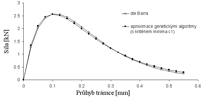 Řešení tohoto problému lze vidět také ve změně definice užité funkce (1). Pro tuto aplikaci 2e modelu na studium vlivu stáří betonu na lomové parametry byla užita úprava hodnot parametrů uvedených v Tab. 1 aproximací standardními genetickými algoritmy [2] s kritériem minima parametru c1. Minimální hodnota tohoto parametru je vhodná z hlediska jednoznačnosti řešení a zároveň zajišťuje nejvyšší míru stability funkce vzhledem k chybě určení parametrů c2 a c3. Výsledky aproximací jsou uvedeny v Tab. 2.