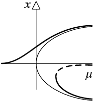 Pro složitější dynamické systémy uvedených vlastností existuje více variant stability pevných bodů v uvedených oblastech, my se však zaměříme pouze na tento (tzv. superkritický) typ průběhu, který odpovídá chování vzepjatého nosníku.